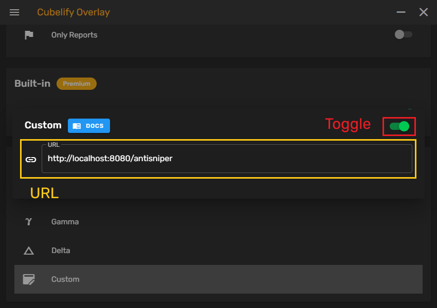 The custom anti-sniper feature allows you to use a custom anti-sniper solution with the overlay. After you set it up a request will be sent to the provided API every time a player is added to the overlay or refreshed, and the overlay will display the response received in a user-friendly way.