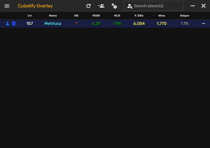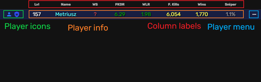 The player info section contains the values for all the columns that are enabled for a player. By default for Bed Wars these columns include player's level (which is the first column) and their Final Kill Death Ratio (which is the fourth column).
