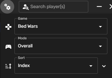 This button opens the options menu, which contains some most basic options allowing you to customize the behavior of the overlay - those include the game for which stats are displayed, the mode, the statistic by which players are sorted and the sorting direction.