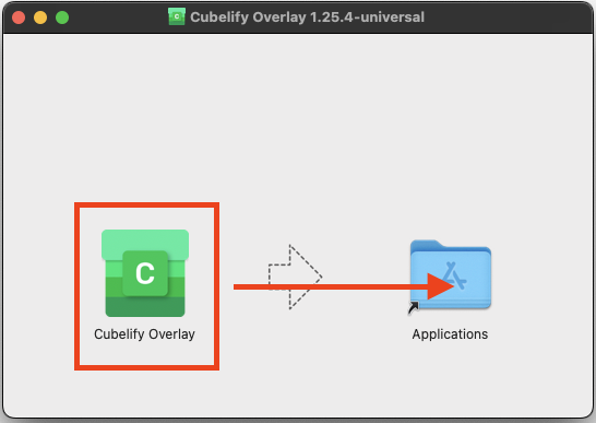 Open the downloaded Cubelify Overlay-X.X.X-universal.dmg file. Grab the Cubelify Overlay file and drag it into the