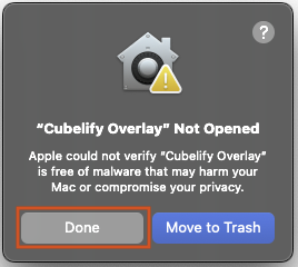 As the app is not code signed due to the high annual cost of an Apple Developer Program membership, when you launch it for the first time you'll see the following prompt - please make sure to press Done here.