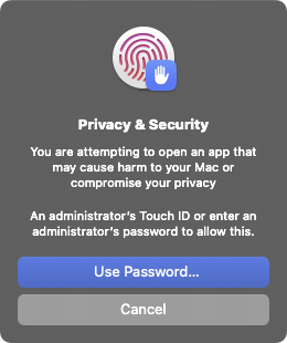 You'll need to press Open Anyway again to confirm it, and then authenticate with Touch ID or a password.