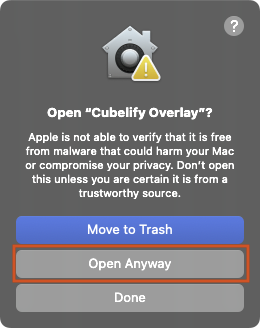 After launching the app for the first time, open System Settings → Privacy & Security. Scroll down to the Security section and locate the item for the Cubelify Overlay, and then press Open Anyway next to it.