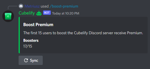 Another way you can obtain Premium is by boosting the official Cubelify Discord server . Please note that this is only available to the first 15 boosters, meaning that if you boost while there are already 15 or more boosters you'll have to wait until one (or more) of them resign, sorted by the time they started boosting in ascending order.