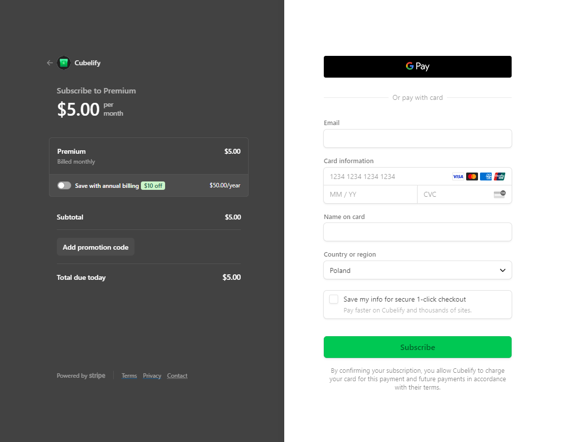 After entering all the required information, press Subscribe to confirm starting your subscription. You might be